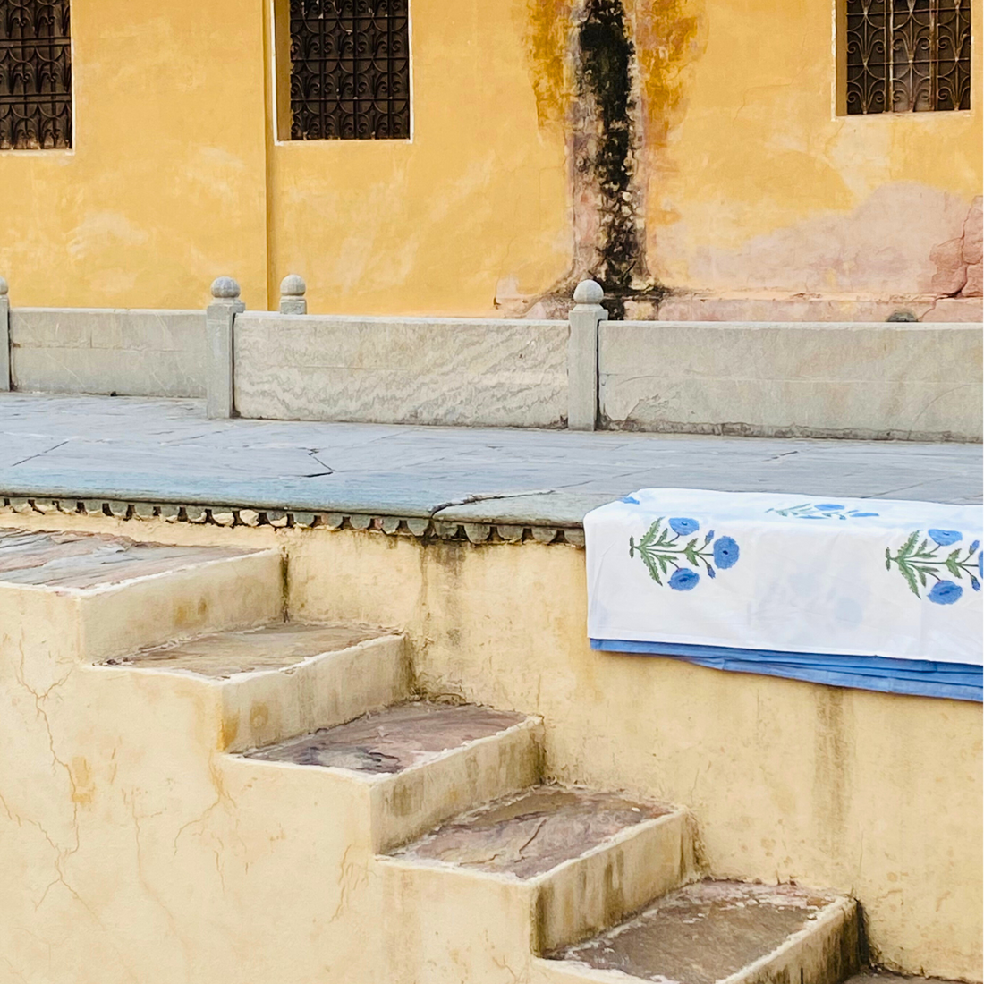 Blue Gardenia Handblock Cotton Mat + Runner 7 Pcs Set