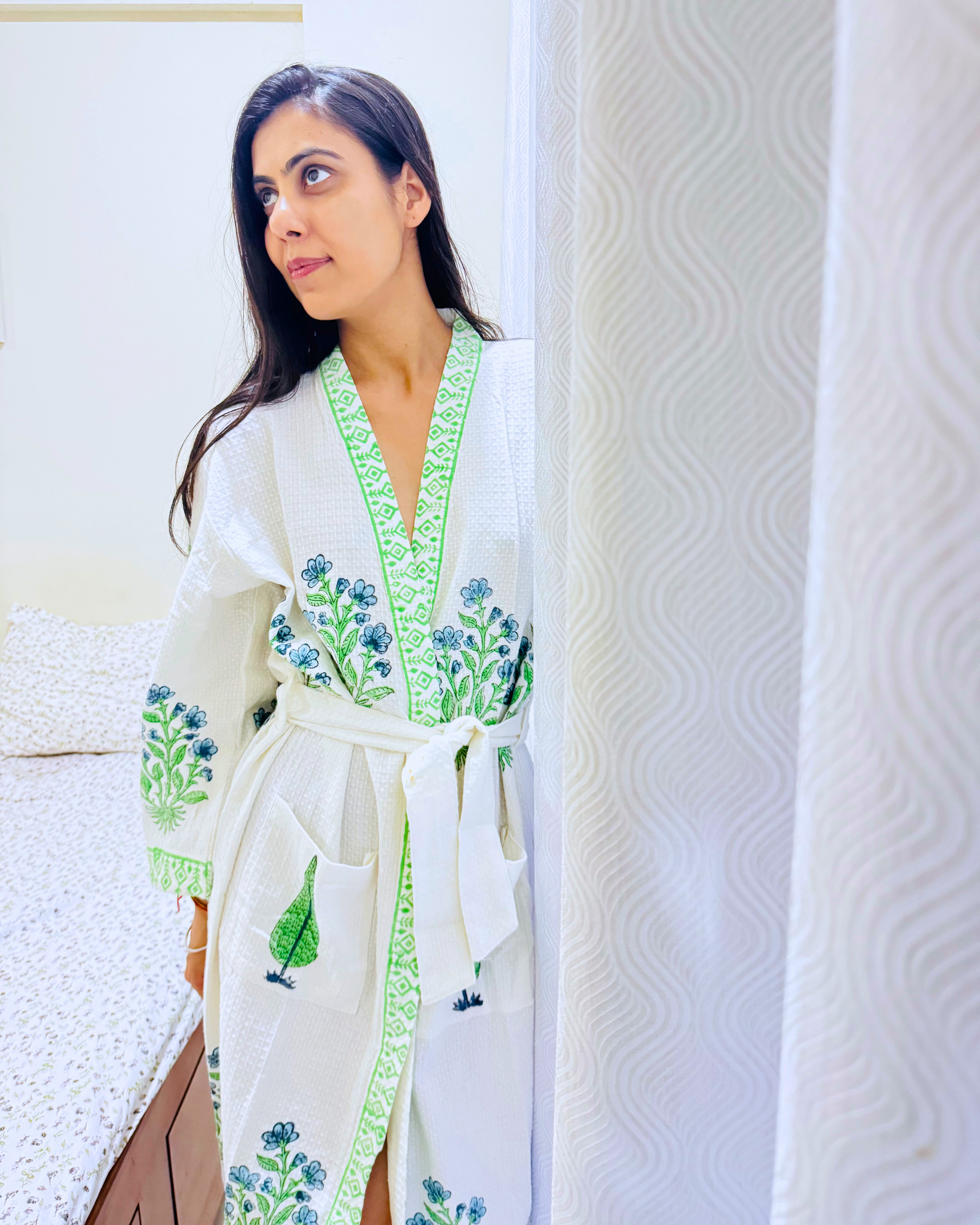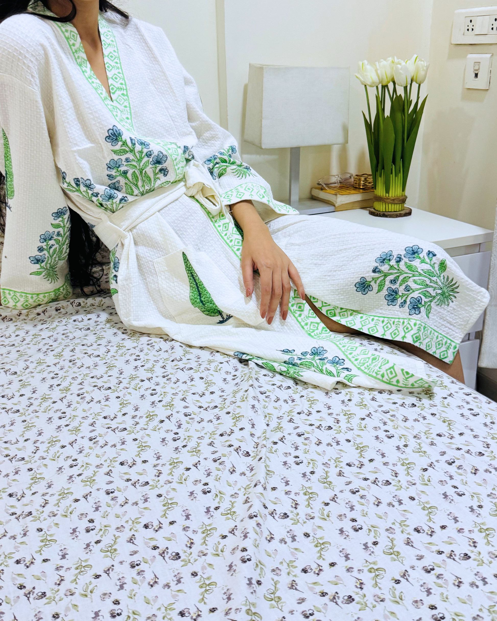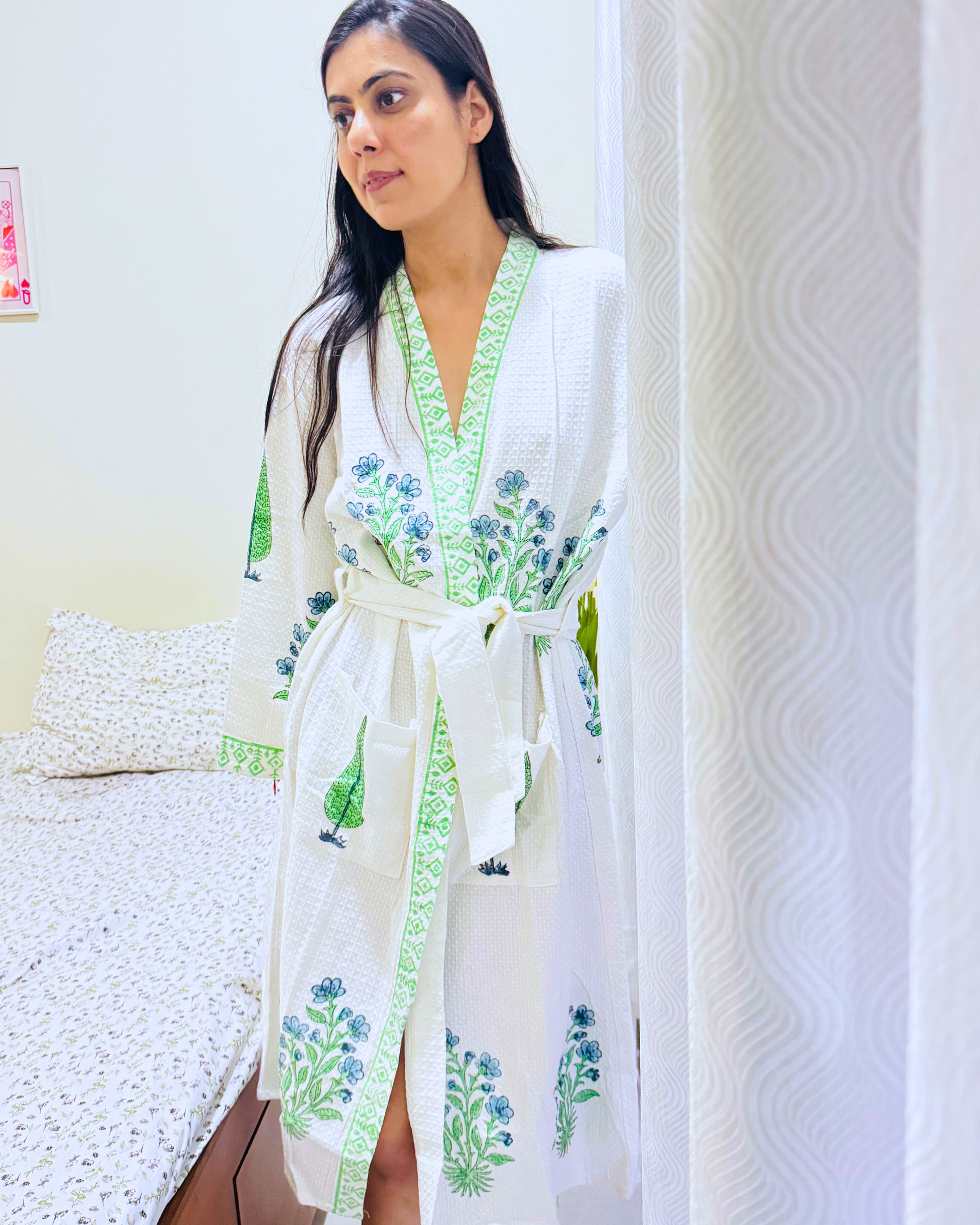 Wrap yourself in effortless comfort with our soft, handblock-printed waffle fabric bathrobe.