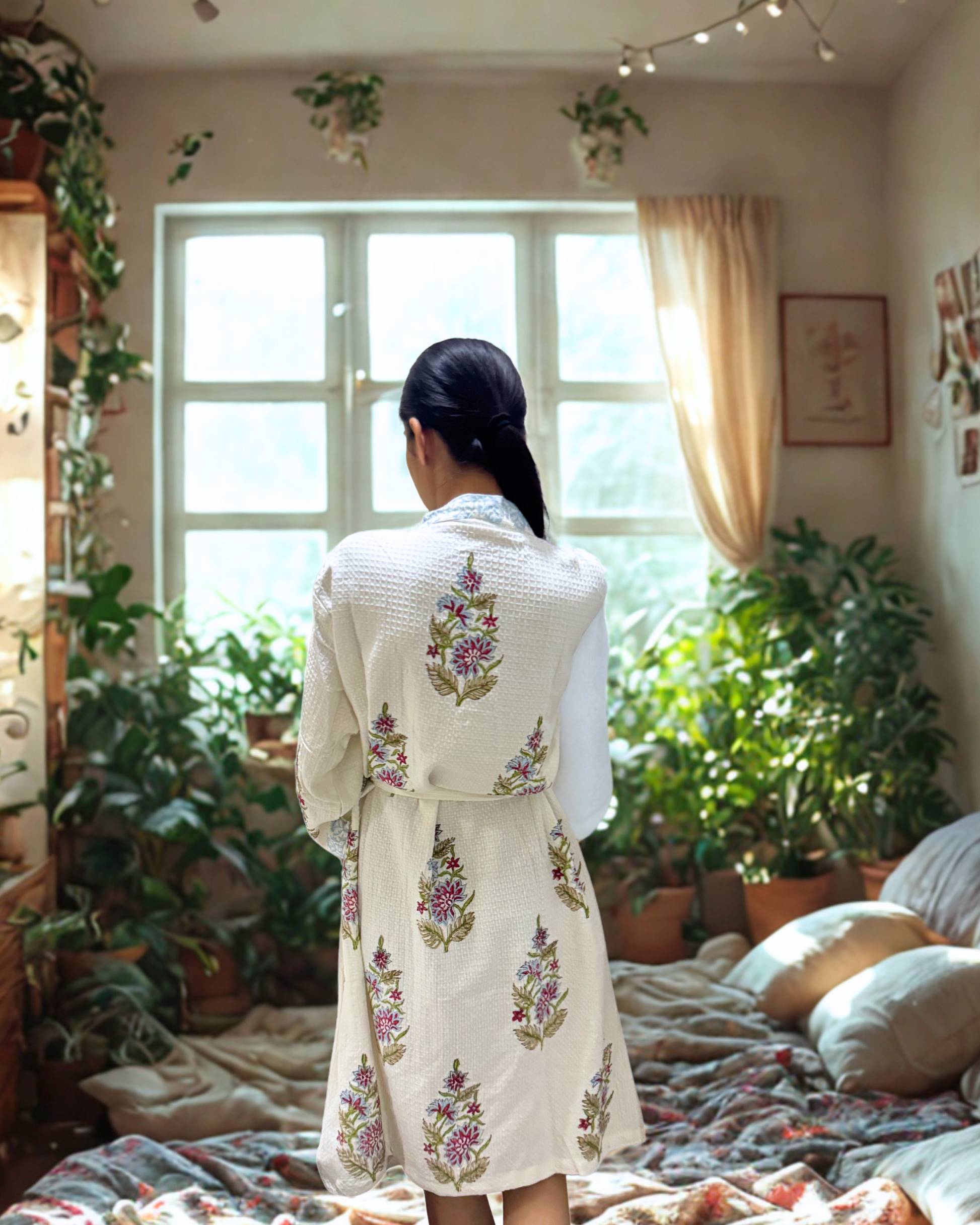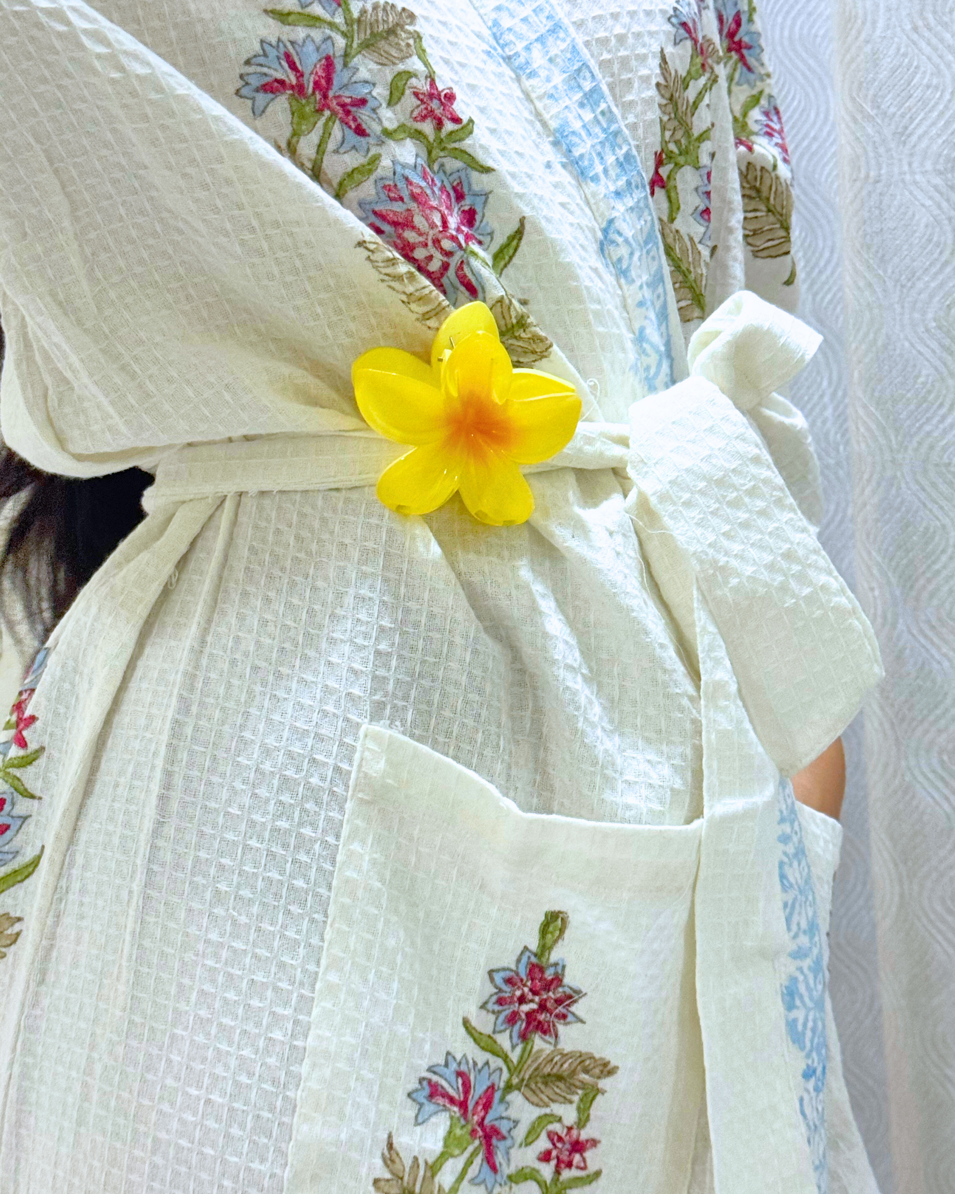Wrap yourself in effortless comfort with our soft, handblock-printed waffle fabric bathrobe.